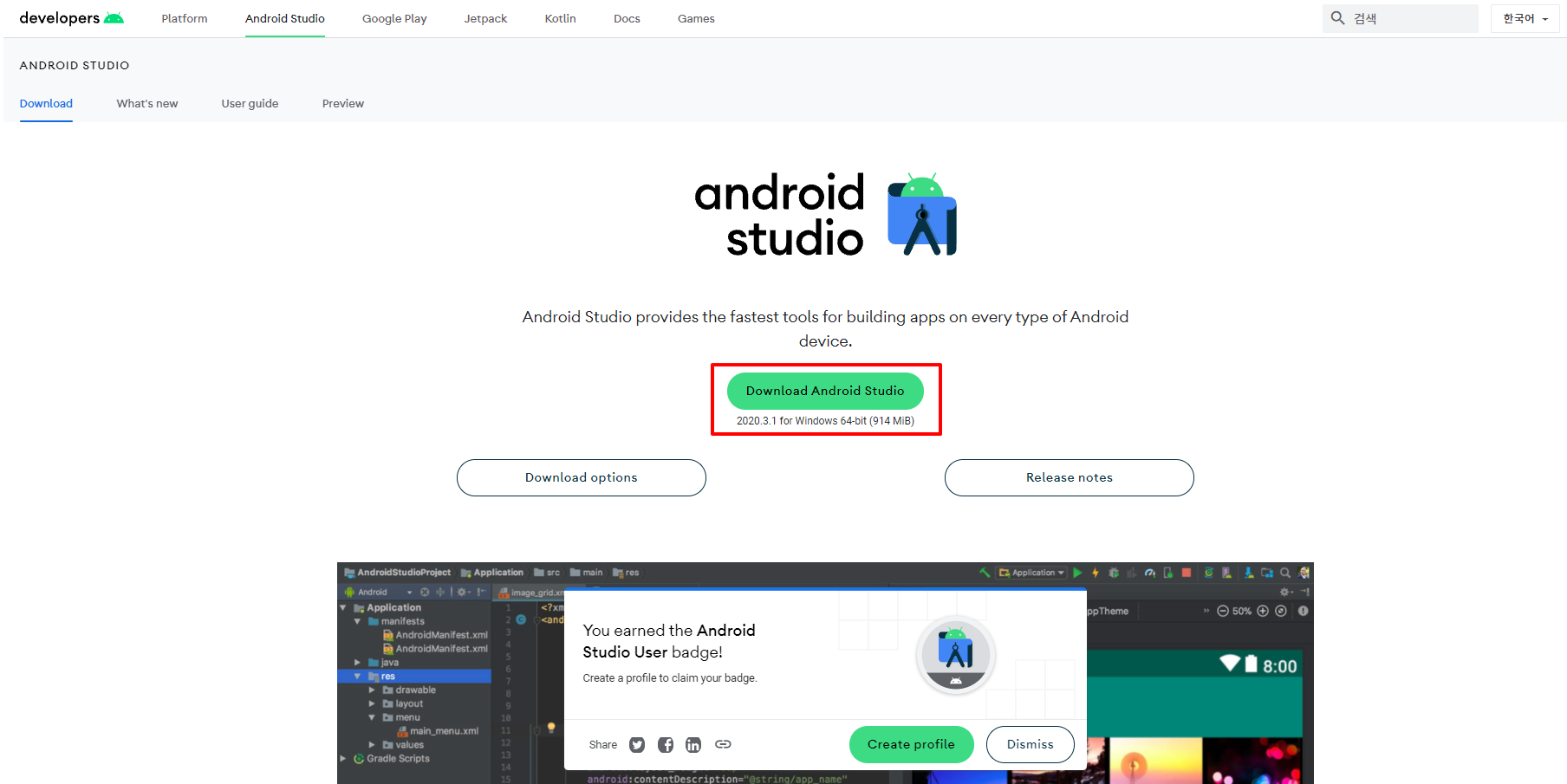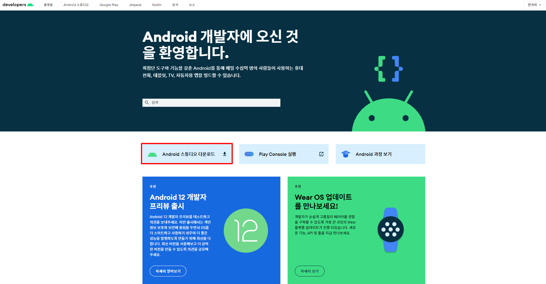 안드로이드 develpoer 사이트 접속 (아래 경로 클릭하면 바로 이동)