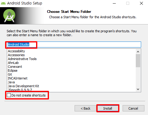 2) 시작 메뉴의 폴더 이름을 Android Studio가 아닌 다른 것으로 바꾸고 싶은 경우 바꿀 수 있음