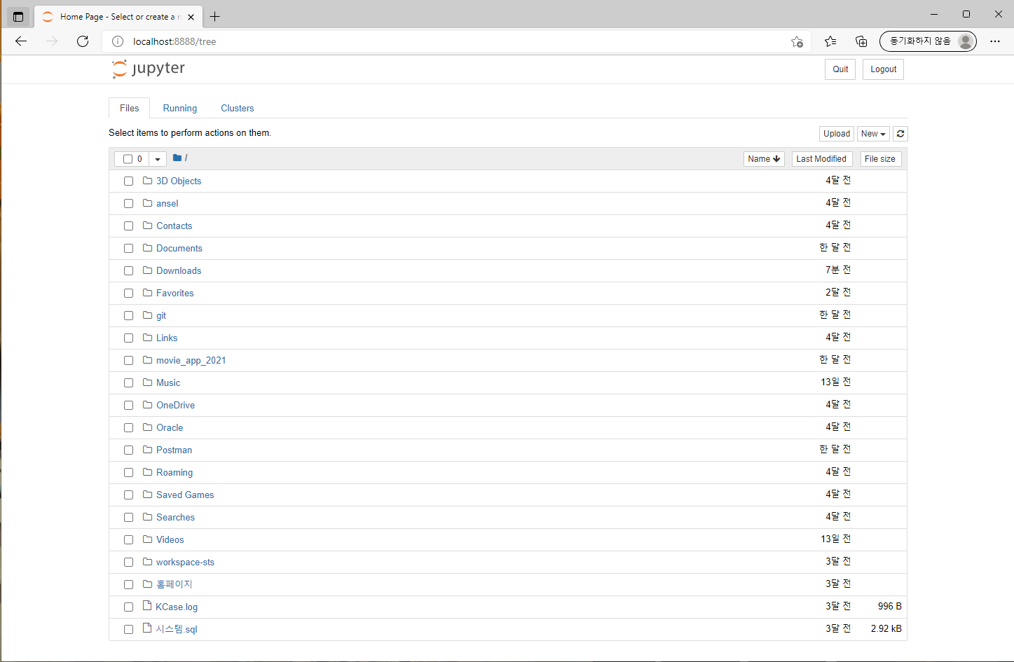 - 기다리면 주피터 노트북 화면이 뜨거나 URL 복사 붙여넣기해서 열면 아래와 같은 화면이 뜸