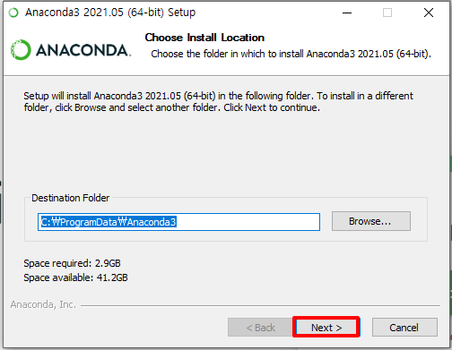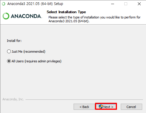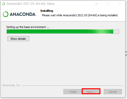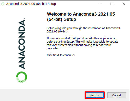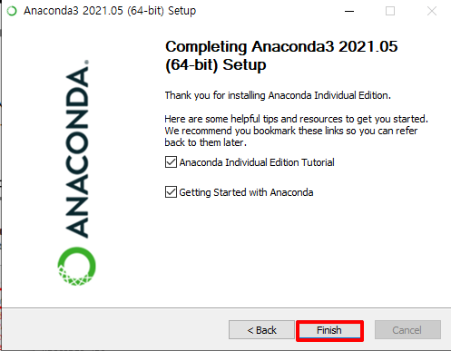 - 이 옵션을 체즈하지 않고 설치할 경우 매번 아나콘다 콘솔을 따로 띄어서 명령어를 사용해야 함