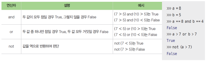 - 논리 연산자 : and or not 문을 사용해 조건을 확장할 수 있음