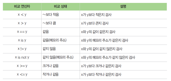 - 결과는 참(True)이나 거짓(False)이 됨