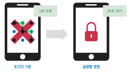 - 스마트폰 잠금 해제 패턴이 5회 틀리면, 20초 동안 대기 상태로 만들어라