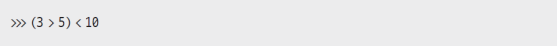 - 먼저 3 > 5는 False이고 False는 결국 0으로 치환. 다시 치환하면 (0) < 10이 되고, 이 값은 참이므로 True가 반환