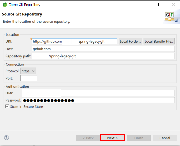 5. 다시 STS 복귀한뒤 복사한 URL을 붙여넣고 깃헙 아이디와 비밀번호를 입력