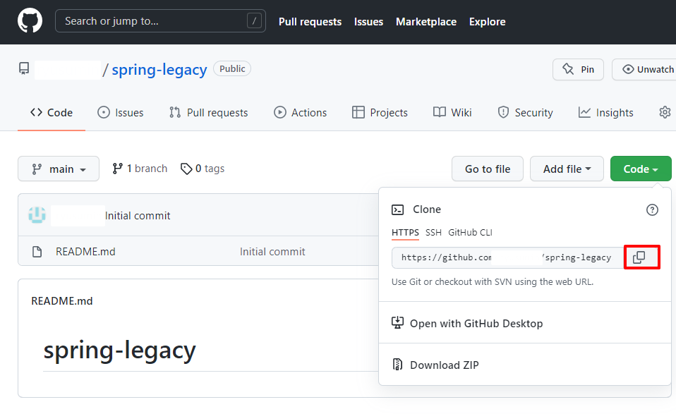 4. (잠깐 STS는 STOP) GitHub 웹사이트에 들어가 연동할 Repo 페이지로 들어가서 url 복사!