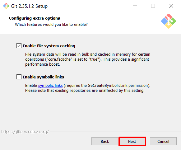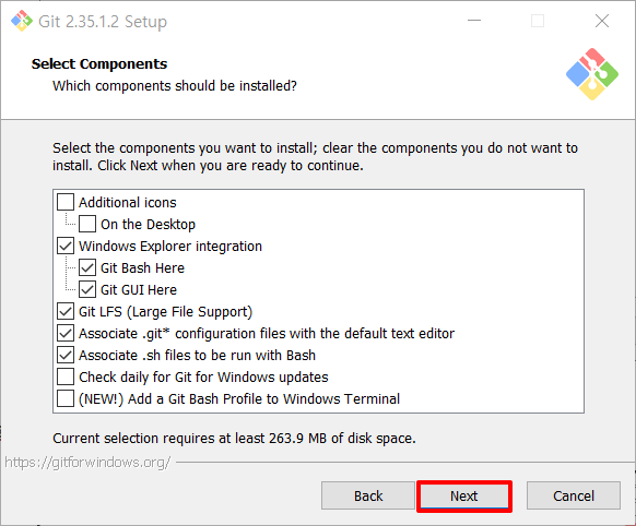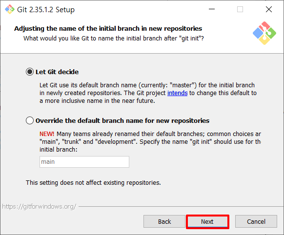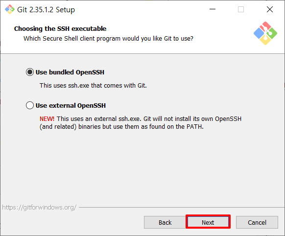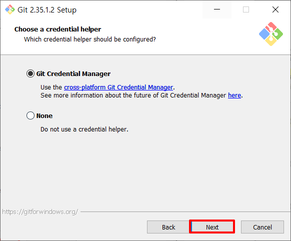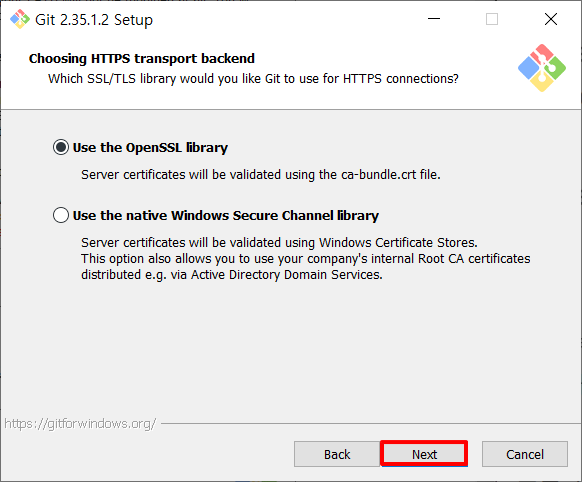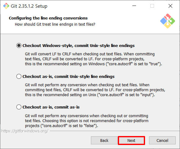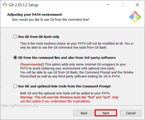 9. 커맨드 라인에서 어떤 방법으로 깃을 사용할지 선택하는 화면에서는 기본값 그대로 Next