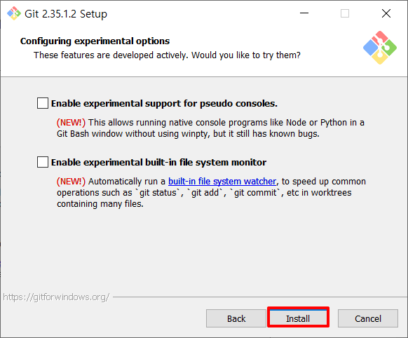 16. 실험적 지원은 체크 하지 않은 기본값 그대로 Install