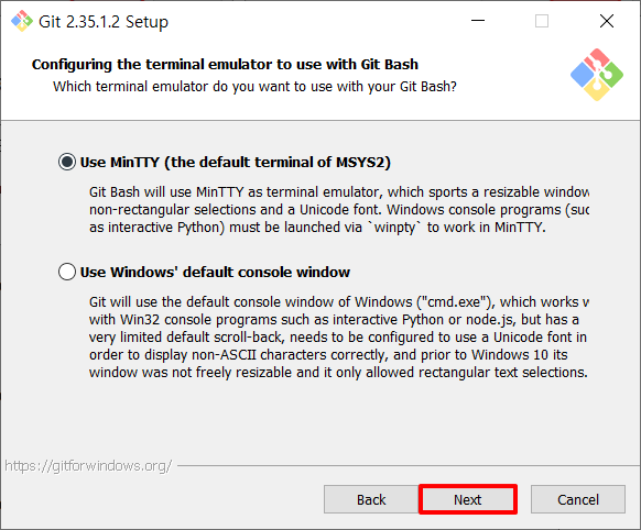 12. Git Bash 터미널 에뮬레이터의 설정 후 Next