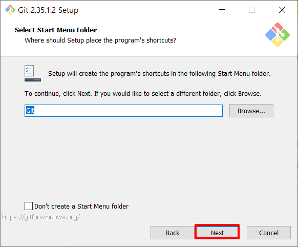 6. 스타트 메뉴 폴더 선택 (기본값 그대로 Git으로 두고 Next 클릭)