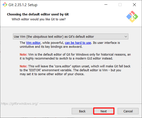 7. 기본값으로 vim이 선택되어 있음. 그대로 Next