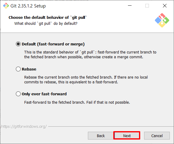 13. git pull 명령어의 기본 동작을 선택 후 Next