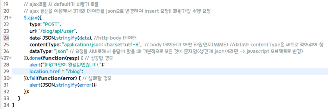 스프링부트 강좌 38강(블로그 프로젝트) - 회원가입하기 Ajax 요청을 듣다가 분명히 작동해야 하는데 버튼을 눌러도 done으로 넘어가지 않았다.